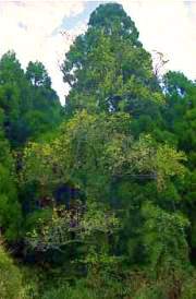 お待たせしました〜。→これがヤマナシの樹(き)の全体写真です。ちょっと、後ろのスギの緑色とまぎらわしくなってしまったのですが、大人が2人でかかえてやっとくらいの太さです。高さは、スギよりちょっと低いくらい。8〜10mくらいでしょうか?樹(き)の皮にはコケやらなにやらくっついていて、本当の色が何が何やら分かりません。